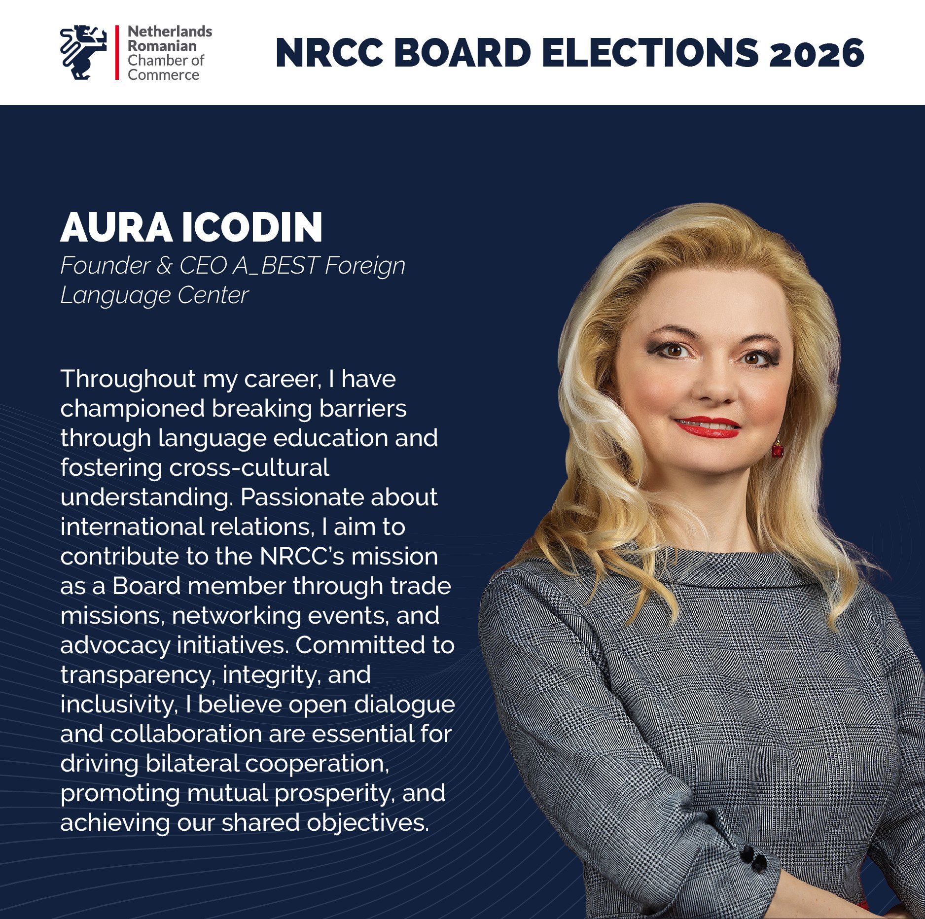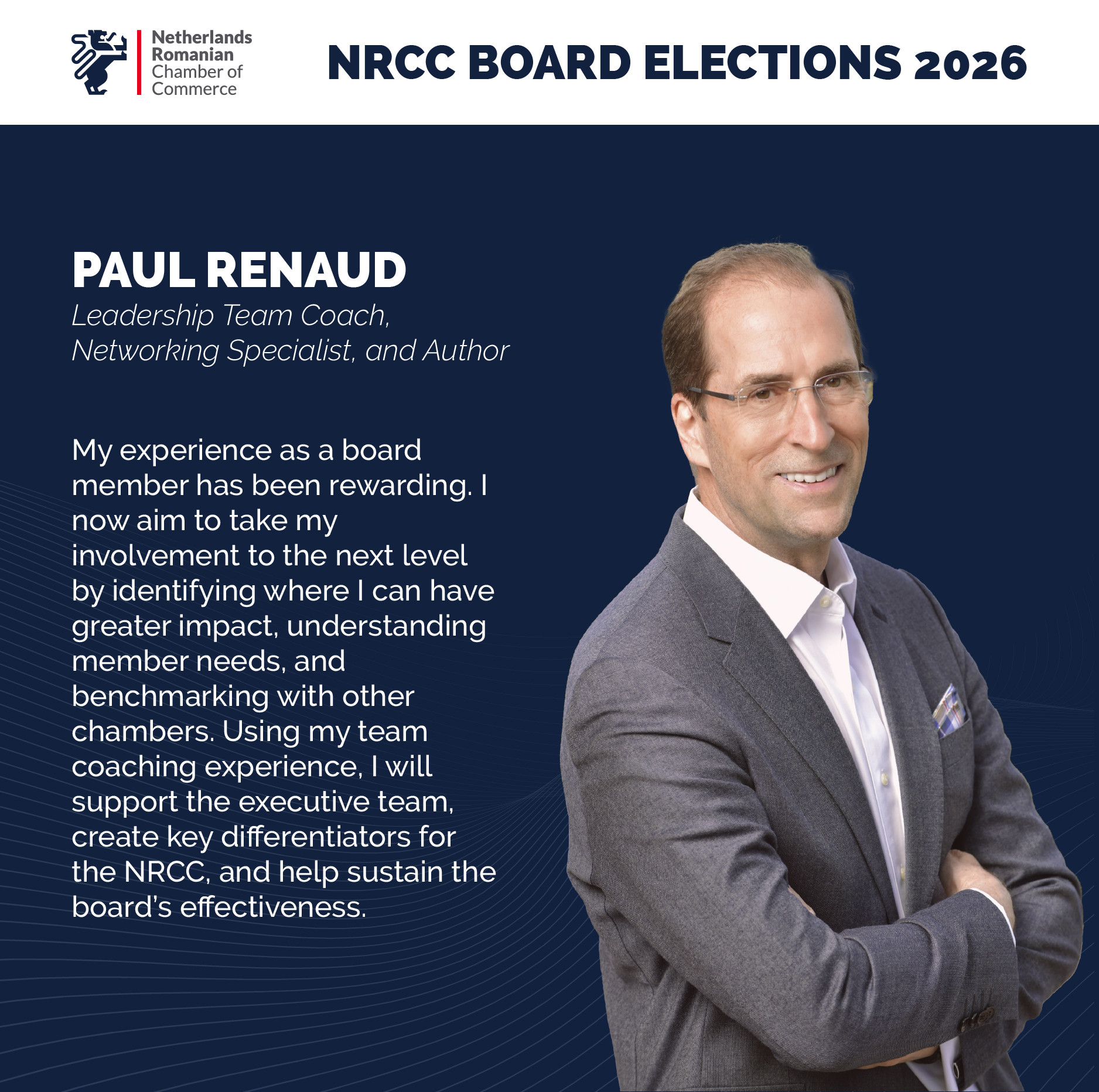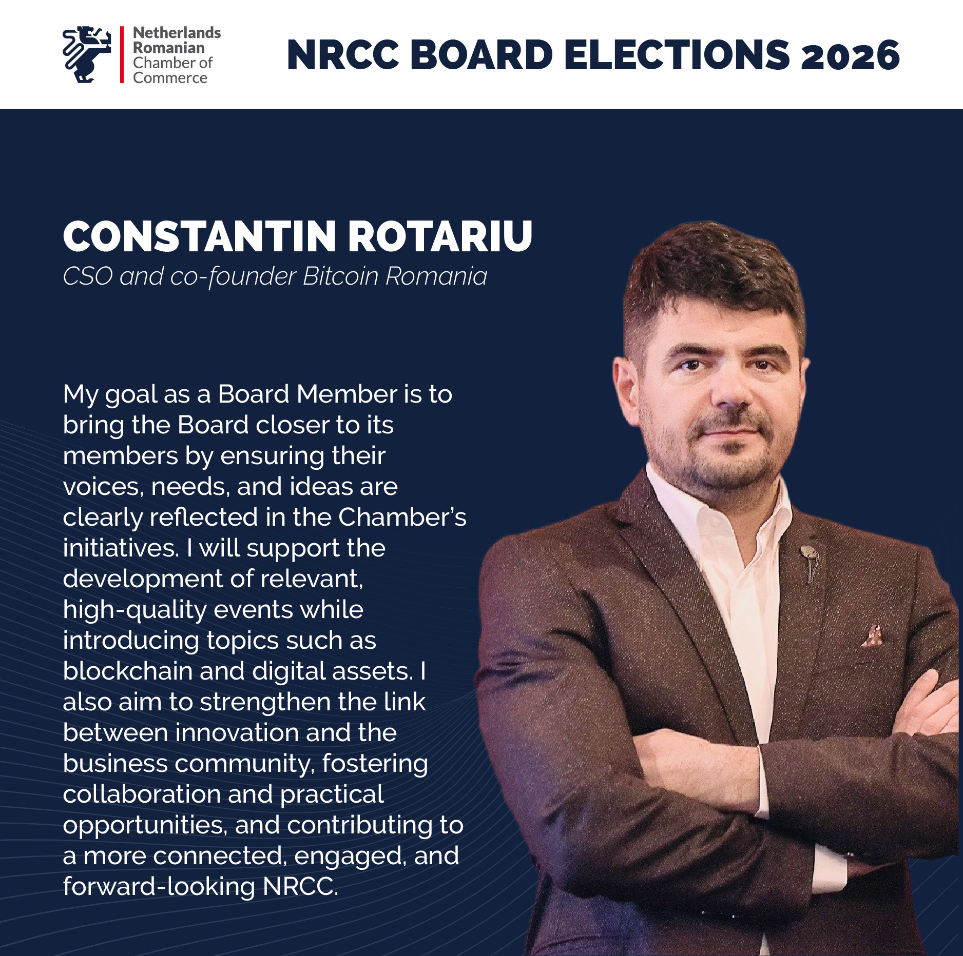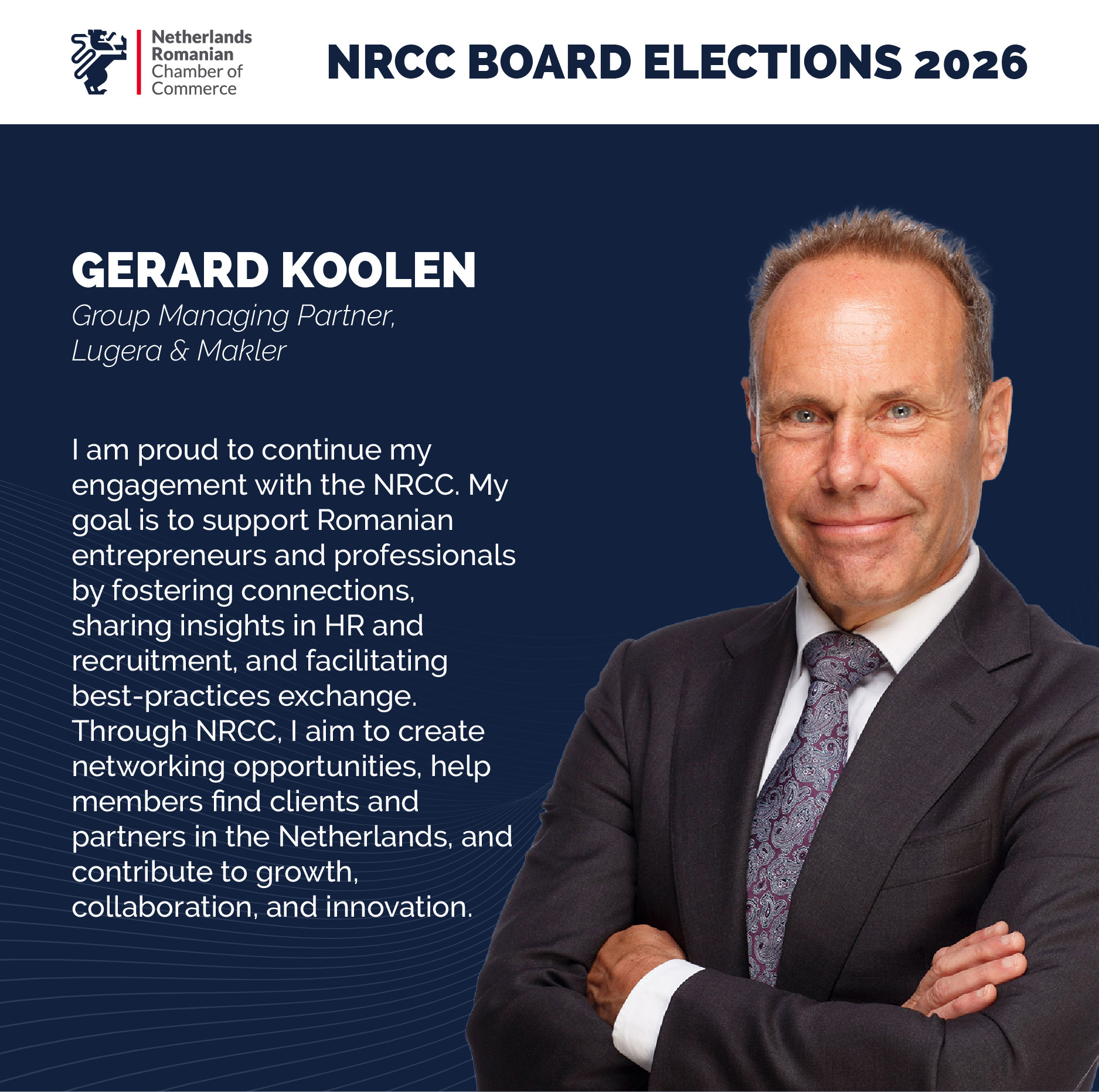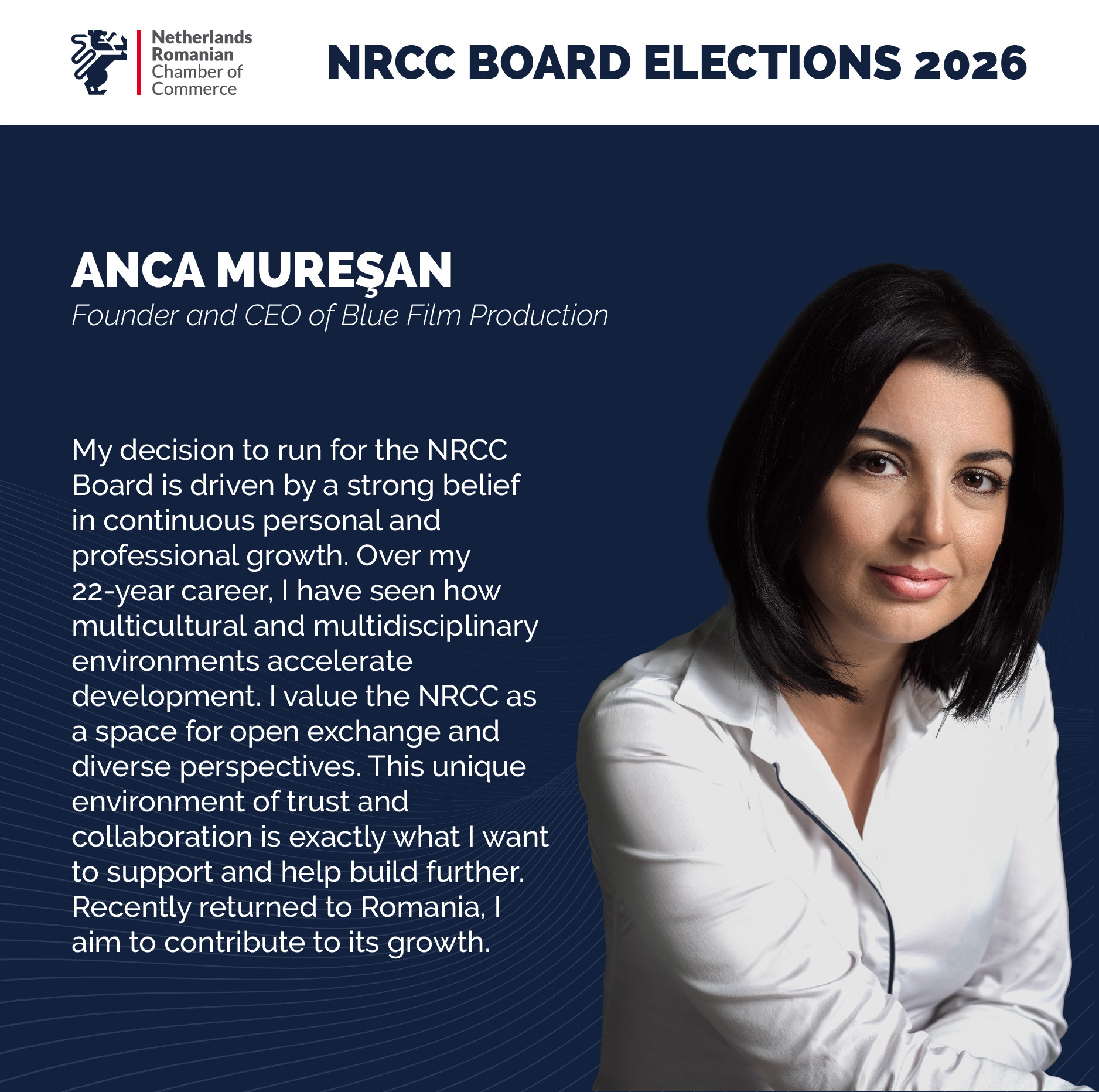 The agenda will include a Q&A session, and all members are encouraged to send questions regarding the Chamber’s activities to NRCC Vice President Serban Isopescu and Executive Director Maurits Dohmen at info@nrcc.ro.